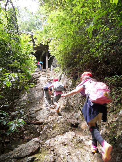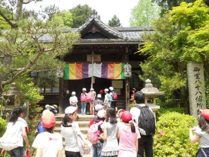 一番札所まで移動し、先生から注意を聞いた後、子どもたちは班ごとに、八十八ヶ所を巡っていきます。ひとつひとつ札所の番号を数えながら、元気な足取りで上ってくる子どもたちでしたが、後半になると足が重くなってきたようです。しかし、友だちと励まし合いながら、前へ進む姿があり、「スクラム4年!」の力が発揮されていたように思いました。