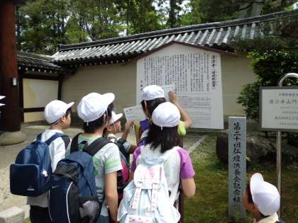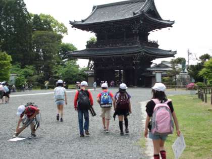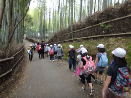 先週17日(木)に春の遠足で嵯峨野めぐりに行きました。歴史の場所でもある[嵯峨野露]をオリエンテーリングで探検しました。清凉寺を出発し、鳥居や化野念仏寺に各ポイントがあり、グループに分かれて協力して問題を解いていきました。天気もよくとても暑かったので汗をかいている子どもたちがたくさんいました。予定より早く亀山公園のゴールに到着している子どもたちがたくさんいました。子どもたちの体力には、ほんとうに驚きました。亀山公園でお弁当を食べたあとは、芝生広場で遊んで、景色のとてもきれいな竹林の道を通って帰りました。竹林を歩く子どもたちの素敵な笑顔が印象的でした。楽しい思い出ができたと思います。