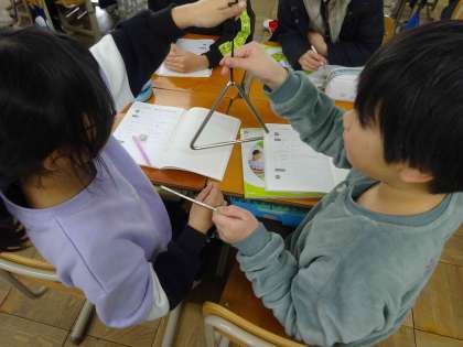 理科「音のせいしつ」の学習でトライアングルを使って音がでているときのもののようすを調べました。