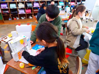 図画工作科で『ともだちハウス』を作っています。造形展に向けて、作品づくりをしています。子どもたちは、友達の作品を見て話をしながら工夫を見つけていました。