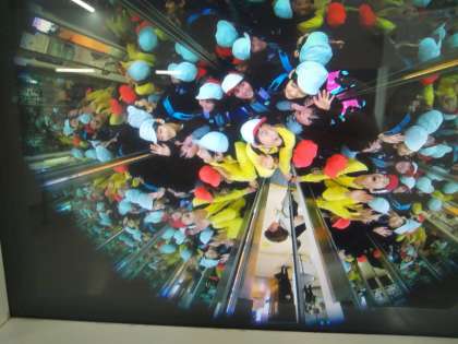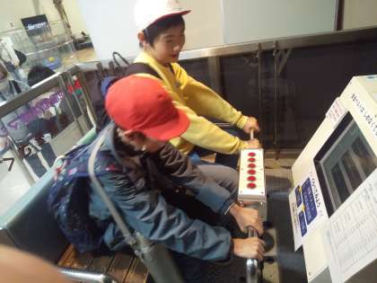 展示学習では、「地震動体験マシーン」で震度6の揺れを体験し、「こんな揺れが来たら怖くて逃げられない」と地震の恐ろしさを感じていました。人間万華鏡では、友だちと一緒に入り、鏡に映る大勢の自分たちを見て大興奮でした。