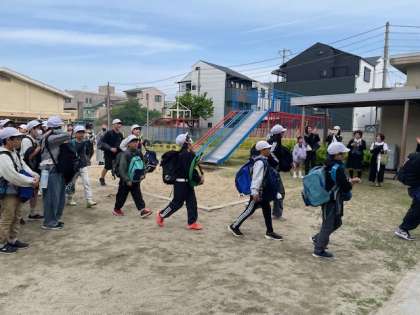午前7時30分に運動場に集合し、6年生は、元気に出発しました。