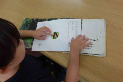 そこで、公共図書館からもいろいろな種類の本の貸出を受け、子どもたちに紹介したところ、「読みたい!」「見つけたい!」という思いでやる気いっぱい、笑顔いっぱい。
