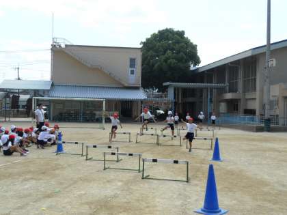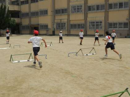 本物のハードルを並べてみると、その高さに反応は様々でした。上手く同じ足で跳ぶことができたり,途中で転んでしまう子もいましたが,みんな一生懸命にハードルを越えていきました。