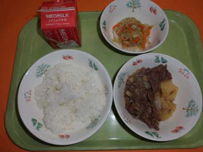 甘辛く煮た肉じゃがとさっぱりしたごま酢煮との組み合わせです。