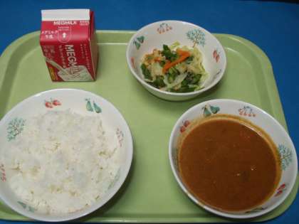 今日は,みんなの大好きなカレーでした。中間休みの頃にはカレーの匂いがしていたので子どもたちは「やったぁー今日はカレーや」と喜んでくれていました。給食室では時間をかけてルーも手作りしているので,おいしいカレーが出来ました。