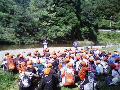 今日は,花背山の家から,八桝町にある山村都市交流の森にバスで行きました。近くの川で川遊びを楽しみました。念のため,全員ライフジャケットを着用します。