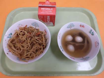 今日は台風17号接近に伴い、献立が変更になりました。学校に保管しておいた非常用物資を使った缶詰や乾物のメニューです。