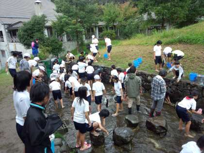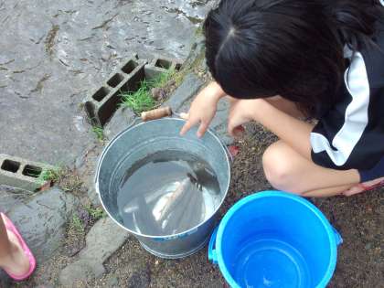 本日の午前中の活動は,魚つかみ体験です。現地は雨模様です。子どもたちは,雨に降られては「キャーキャー」,魚をつかんでは「キャーキャー」大騒ぎ。お天気には恵まれませんでしたが,楽しく活動することができました。