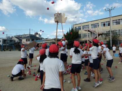 台風の目・大なわとび・おじゃま玉入れなどをしました。他にも整列やかけ声でも点数がはいったりしてとても楽しいスポーツ大会になりました。