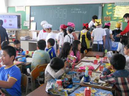 6年生は机の準備,今年から4・5年生が給食当番をしています。