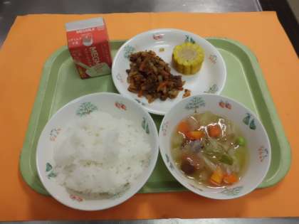 今日のドライカレーには牛蒡・こんにゃくが入りました。スープ煮は大豆・手ぼう豆・金時豆・枝豆が入りました。カットコーンは子供たちに大人気でした。