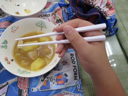 おはしの持ち方は,食事の度に意識することで上達します。おはしを正しく持つと,食べ物がつまみやすなったり,食べこぼしが少なくなったり,結果的に美しく食べることができます。おはしを持たない方の手は食器を持って,姿勢良く食べましょうね。