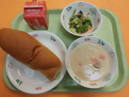 今日のクリームシチューにはじゃがいもがたっぷりと入りました。全校分で30kg(3箱)です。ほくほくのじゃがいものシチューは子供たちに大人気でした。アスパラガスのソティの方にはハート型の「しあわせにんじん」が入りました。