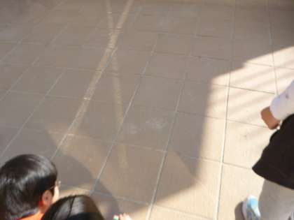 鏡ではねかえした太陽の光の道すじが地面にうつるようにして