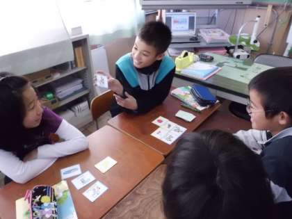 今回の授業は「好きなものはなに?」。カードを引いて、班の友だちに英語で聞き、答えてもらいます。