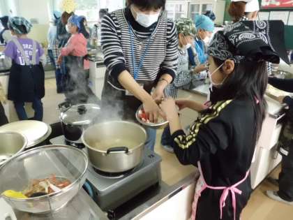 お母さん方にも手伝っていただきながら,調理をしました。