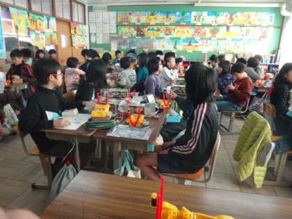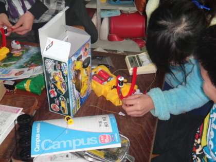 乾電池が1個のときと2個のときで引きつけられた釘の数と電流の大きさの変化に子どもたちは驚いていました。