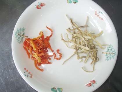 炊きこみ五目ごはんは,昆布と削り節でだしを取ったなかに料理酒・みりん・しょうゆを煮立てまぐろフレーク・乾燥ごぼう(2枚目の写真)・乾燥にんじん(2枚目の写真)・干ししいたけ・ひじきを加えて煮ます。沸騰する直前に水につけておいた米を入れて火加減を調節しながら炊きます。
