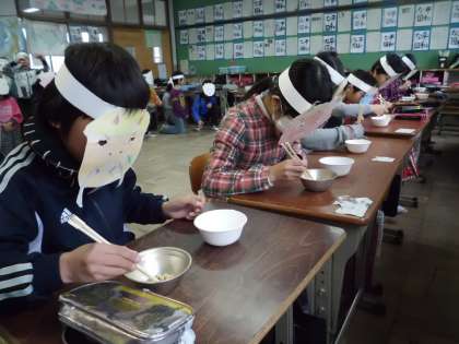 です。先週に作ったオニのお面を各々かぶり,それをつけて班対抗豆つまみリレーを