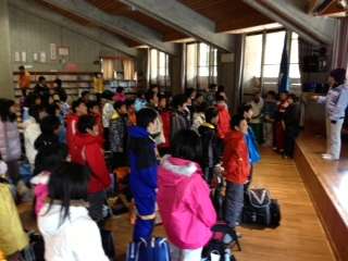 無事,山の家に到着しました。さすがに山の風は冷たいです。ホールで入所式をしました。