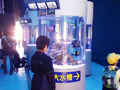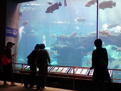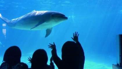 目の前を大きなイルカが泳いでいます。私たちにあいさつしています。たくさんの魚が大きな水そうの中を優雅に泳いでいます。