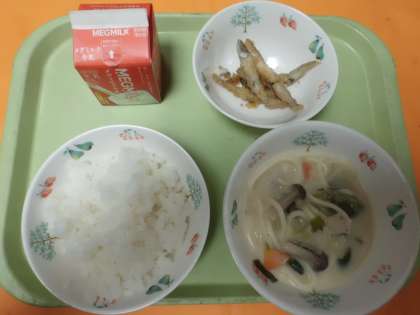 今日の献立の豆乳鍋は、昆布出汁に豆乳、白味噌、信州味噌と醤油を加えてあじつけし、野菜や豚肉をいれて最後に生うどんを加えました。たくさんの具材と豆乳のまろやかな味を楽しんで食べました。