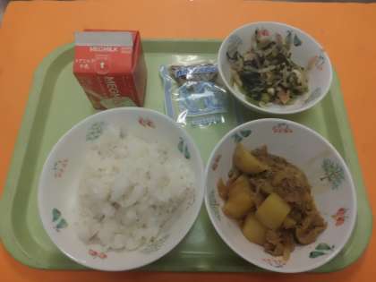 今日は豚肉を使った肉じゃがです。カレーで風味をつけてあるので子供たちにも大人気です。付け合わせの切干大根もよく食べてくれました。