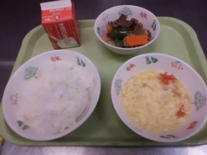 今日は、焼肉と旬のトマトを使ったスープです。チキンスープに塩コショウ、薄口しょうゆなどで味付けし、玉ねぎ、トマトを入れて卵でとじてあります。やさしい味のスープで、子供たちにも人気があります。