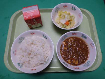 キーマカレーは、ひき肉とみじん切りにした野菜を炒めて作る、汁気のないカレーです。給食では野菜の他に、ミックスビーンズも加えて作ってあります。いつものカレーと少し違いますが、皆とてもよく食べてくれました。