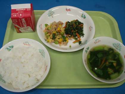 今日はご飯にチャーハンの具を混ぜて食べる献立でした。今日はどのクラスもご飯をたくさん食べてくれました。