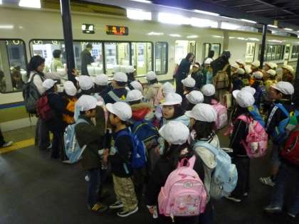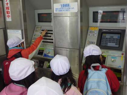 秋の校外学習で秋みつけに行ってきました。そして,帰りの電車では,生活科の学習の1つとして,自分で券売機で切符を買い,改札を通って最後まで自分で切符を持ち,電車を降りるという体験をしました。