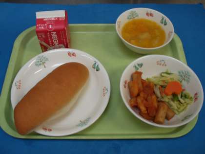 今日はコッペパンにソーセージのトマト煮をはさんで食べる献立だったので,パンの苦手な子どもも食べやすかったみたいです。