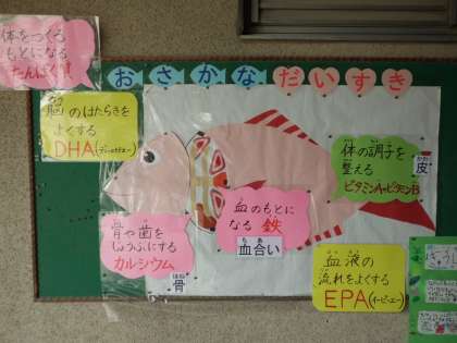 給食室前に大きな魚がいます。給食のサービスホール前の掲示版です。