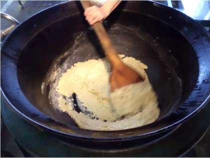 熱くなった釜にバターをとかし,小麦粉をふるい入れ,いためます。