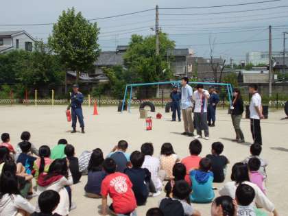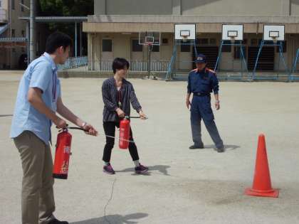 理科室から火災発生!という想定で避難訓練をしました。1年生は初めてのことでしたがきちんと並んで避難できました。消防署の方の説明を聞き,練習用の消火器を使って消火もしました。