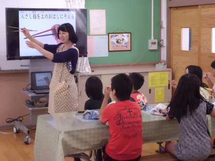 ランチルームでは.お箸のもち方を指導しています。スライドで紙芝居を見た後,実際に1本ずつお箸を手に持ちました。鉛筆のもち方をした後,もう1本のお箸を手に持つと上手に動かすことができるそうです。