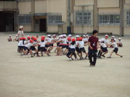 3年生は棒引きの練習をしました。実際に赤組と白組に分かれて引っ張ってみました。同じチームの人と力を合わせて棒をひきます。棒を持つ位置や並び方など工夫できることはありそうです。