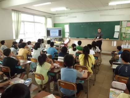 本校では今年もダレン先生が英語の時間に来てくれます。繰り返し発音したりゲームに取り組んだりすることで英語に慣れ親しんでいます。6年生も大きな声で数の数え方やアルファベットを発音していました。