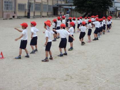 1年生は初めての運動会に向けて,一生懸命練習しています。今日も,運動場でダンスの練習をしました。子どもたちにとって知っている曲みたいで,みんなノリノリで大きな声を出して踊っていました。