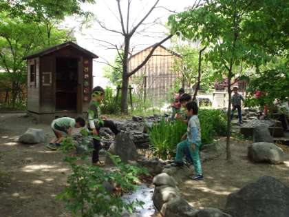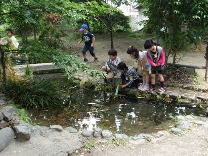 学校の東門の近くに東の森があります。草花や生き物がいて,毎日,たくさんの子どもたちが観察に訪れます。特に,低学年の子が多いです。今日も池をじっと見つめながら小さな生き物を探していました。