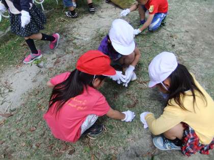 23日は,ごみゼロの取組で,1年生は,学校の花壇の周りの草ぬきをしました。