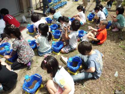 1年生は,今年もあさがおを植えました。自分の植木鉢に土を入れ,種を植えました。これから自分で水をやります。愛情をかけて育てるときっときれいな花が咲くでしょうね。