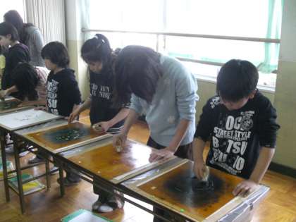 2月3日に,4年生は京友禅体験学習をやりました。子どもたちにとって,先週から楽しみにしていた体験学習でした。初めて,間近で見る京友禅に「色がきれいだな。」「作るのが大変そうだな。」と驚きの声がたくさんあがりました。