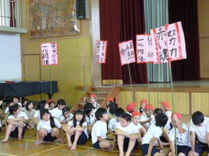 昨日、作成したそれぞれの騎馬の旗を手に練習をしました。
