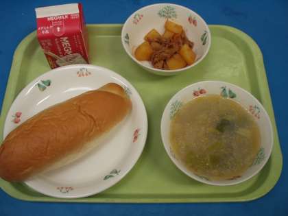 豚肉のケチャップ煮は久々の登場で,パンによくあう献立でした。