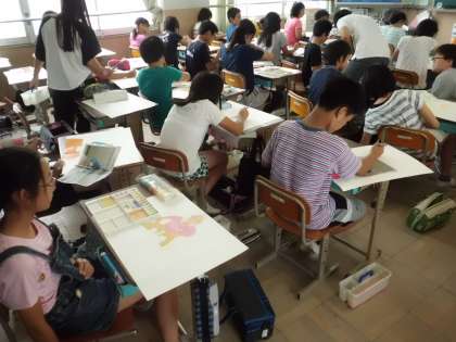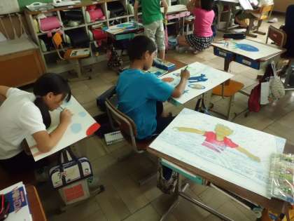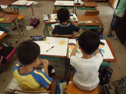 午後,子どもたちの学習の様子を見に行くと,いろんなクラスで絵を描いていました。自分が何かを測っている様子を絵に表現する「計量の図画」です。計量カップやものさしなどいろんなものを使って測っている様子がうかがえました。