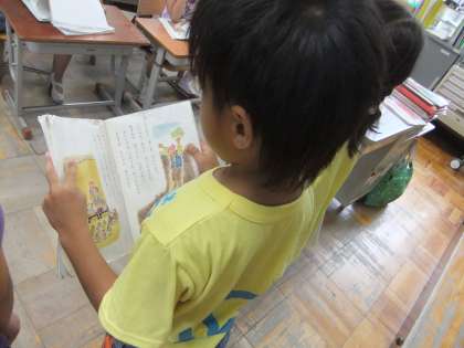 口のあけ方や読む速さを工夫しながら,「おむすびころりん」の物語を読むすすめました。