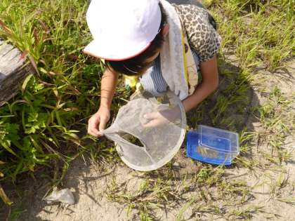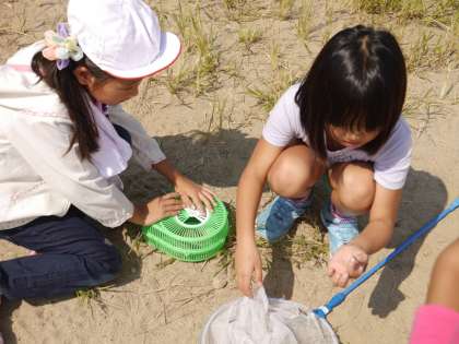 子どもたちは,桂川に着くと元気いっぱい駆け出して,一生懸命に虫をおいかけていました。きれいな声のコオロギ,大きくてすばやいキリギリスなど夏とはまた違う虫をたくさん見つけることができました。