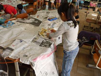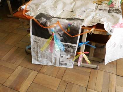 机や椅子をならべて,新聞紙でつないだり,つつんだり